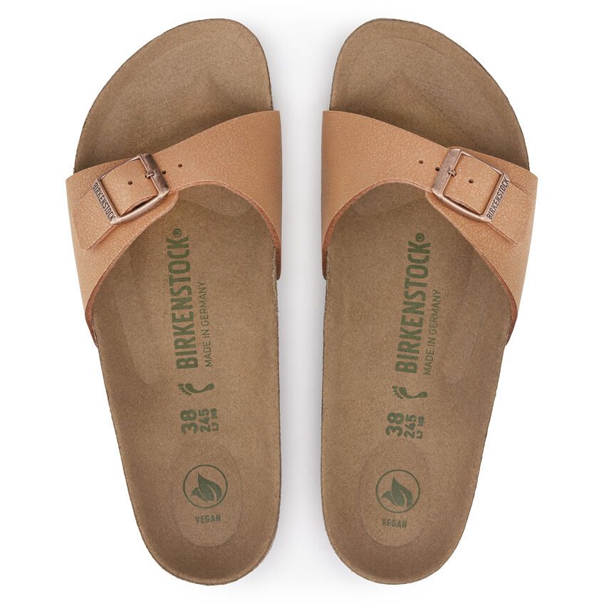 BIRKENSTOCK Madrid je pravi klasik koji oduševljava svijet mode svojim minimalističkim dizajnom. Popularne sandale dobile su ažuriranje materijala i dostupne su u veganskoj verziji. Gornji dio je izrađen od koži prijatnog, izdržljivog sintetičkog materijala Birko-Flor® u sofisticiranom nubuk izgledu koji se može pohvaliti teksturom i bojom koje se gotovo mogu zamijeniti za pravu kožu. Anatomski oblikovani uložak od plute i lateksa Gornji dio: Birko-Flor® nubuk Podstava uloška: mikrofiber Đon: EVA Detalji: remen s individualno podesivom metalnom kopčom